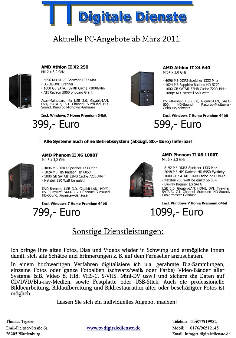 Startseite | Dia/Foto | Video | Schallplatten | PC-Konfiguration | Datenrettung | Angebote | Preise | Rechtliche Hinweise | Links | Kontakt/Anfrage | Sitemap